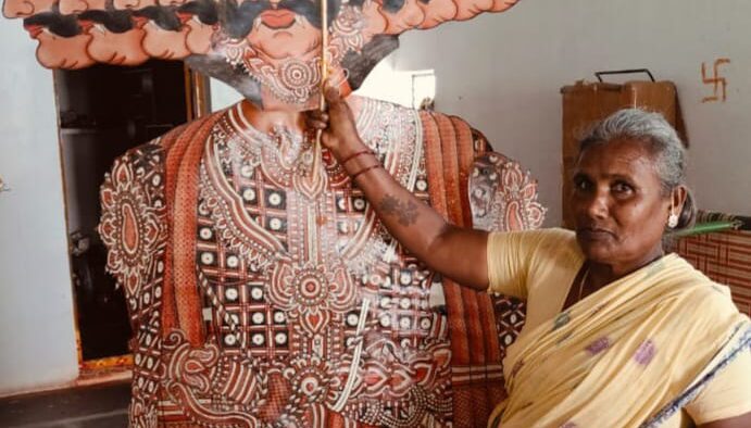 Shivamma’s family has been performing this leather puppet art for more than 1,500 years, telling stories from the Ramayana and Mahabharata. This art form spread to Southeast Asia, where it was adapted to local cultures. We met her in her open workspace in Dharmavaram, where she was receiving congratulatory calls for her prestigious award. For the Shilpa Guru title, Shivamma created an artwork depicting the life of Shri Krishna, featuring scenes from his birth to adulthood, with Radha and Krishna at the center, reminiscent of Ardhanareeshwara. Devout in her spirituality, she takes her workers on an annual pilgrimage to the Arunachaleshwarar shrine in Thiruvannamalai to honor the spiritual side of their work.