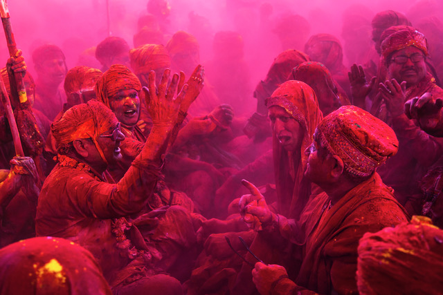 “Bhajans and bhang. Gulaal and gopis. Lathis and Love. Holi in Braj is not an experience for the faint-hearted. A festival that has somewhat lost its lustre around the country is celebrated in its wholesome regalia of colour and laughter in Mathura. The beat of drums matches the thick swathe of colour that hangs around every living being. The ground is a slushy battlefield aided by bhang that is generously consumed and distributed. Add to that the provocative lyrics and lathi-charging women, and holi suddenly assumes more meaning than just the festival of colours,” writes Udit Kulshreshta a photographer who has captured Braj for five years.