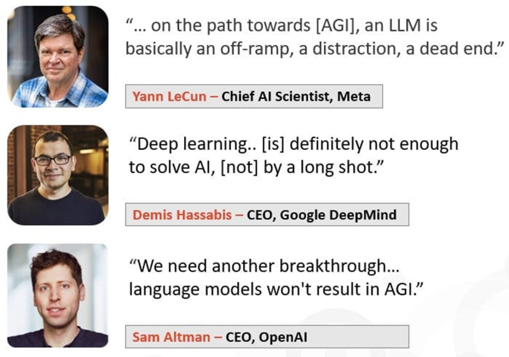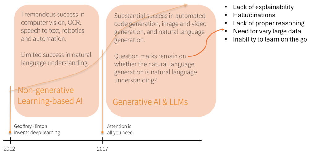- From 2017 onwards: Starts with the seminal work on Attention-based techniques which led to creation of LLMs, which achieved substantial success in automated code-generation, image/video generation, and natural language generation. The LLMs are great retrieval machines, and when fed with a very large amount of information, they can pick an appropriate response from this already vectorized and digested information. But they are not very great at combining information to retrieve new results, because of they need millions of instances of something to learn a generalized pattern, which a small child can grasp with 3-4 examples. And therefore, question marks remain on whether natural language generation is natural language understanding? Inability to explain its outcomes, hallucinations, lack of proper reasoning, need for very large data, and inability to learn on the go are some of its principal drawbacks. We can see leading people in AI saying this already: