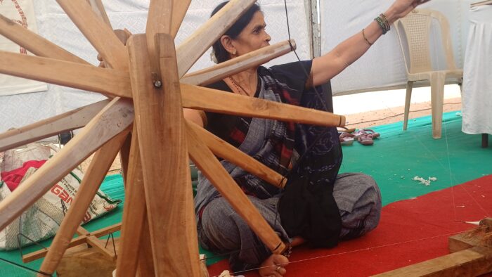 Samyuktha Gorrepati is an independent textile designer and development professional based in Hyderabad, widely recognized for her sustained engagement with the handloom and handicraft sector, particularly the revival and documentation of fine-count handspun Khadi. Her work has focused intensively on Patnulu - also known as Ponduru Khadi - a specialized cotton textile tradition from Srikakulam district, Andhra Pradesh. She has worked closely with Pattusali spinning and weaving communities, supporting ethical production systems and documenting the technical nuances of their practice. Formerly Head Designer at Chitrika, she contributed to building sustainable business enterprises for weavers. She is also the author of Learning the Heart Way: From Cotton to Cloth – Sustaining a Hand-Spun Tradition. We caught up with her at the Mysore Kissan Swaraj Sammelan.
